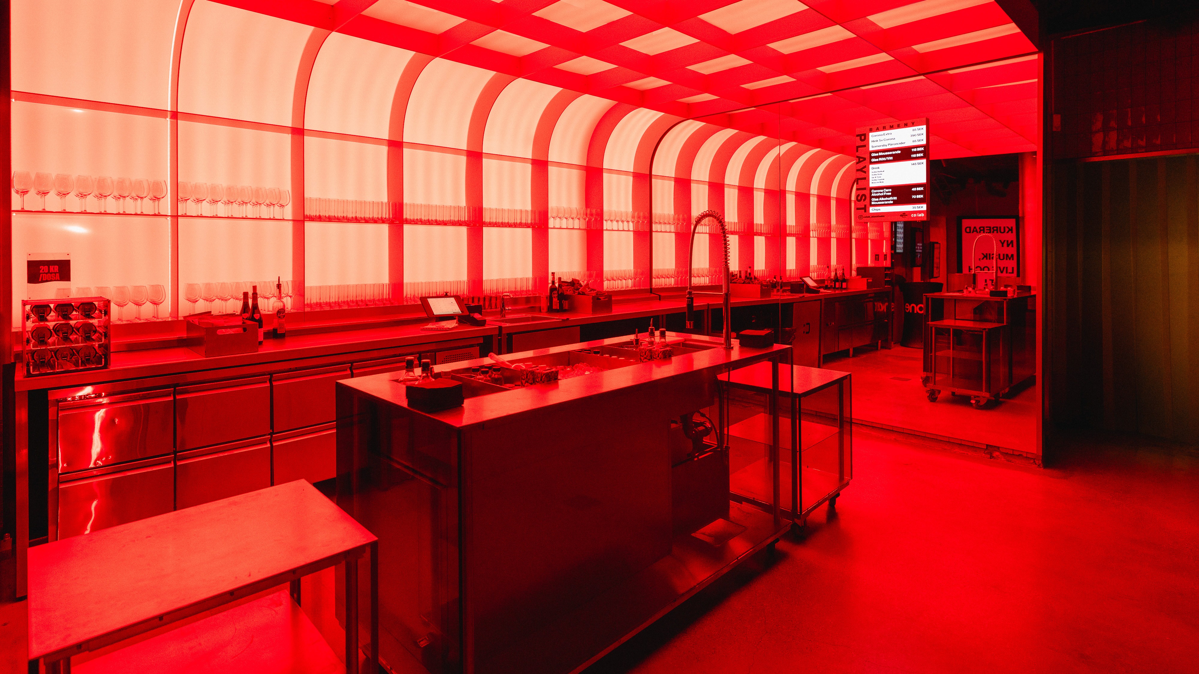 Med integrerade LED-skärmar och ett flexibelt ljussystem kan rummet formas helt efter ert varumärke. Den upplysta baren står i centrum och förstärker helheten som en naturlig samlingspunkt.